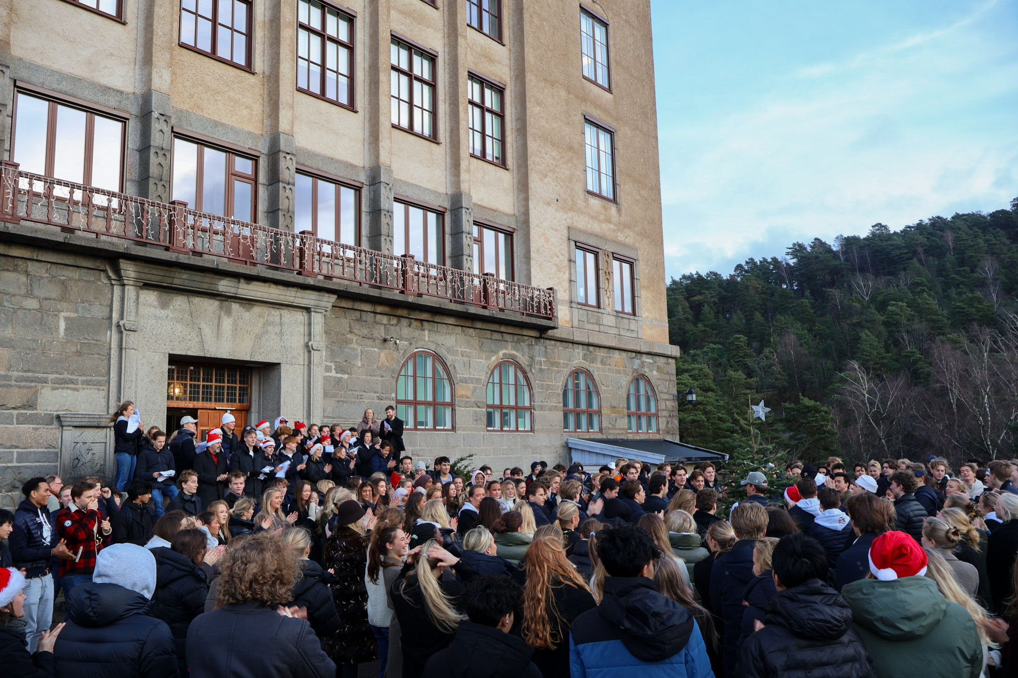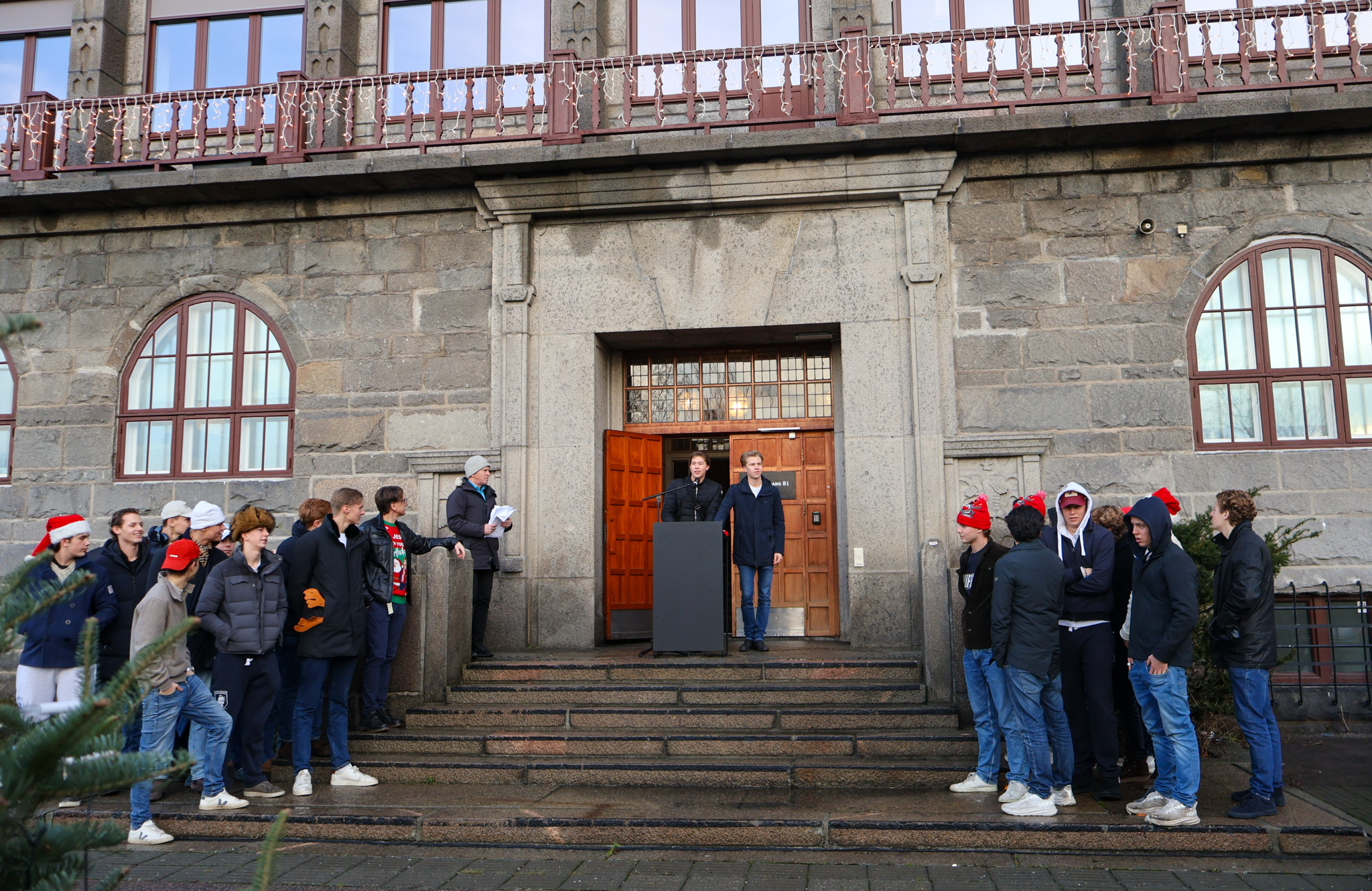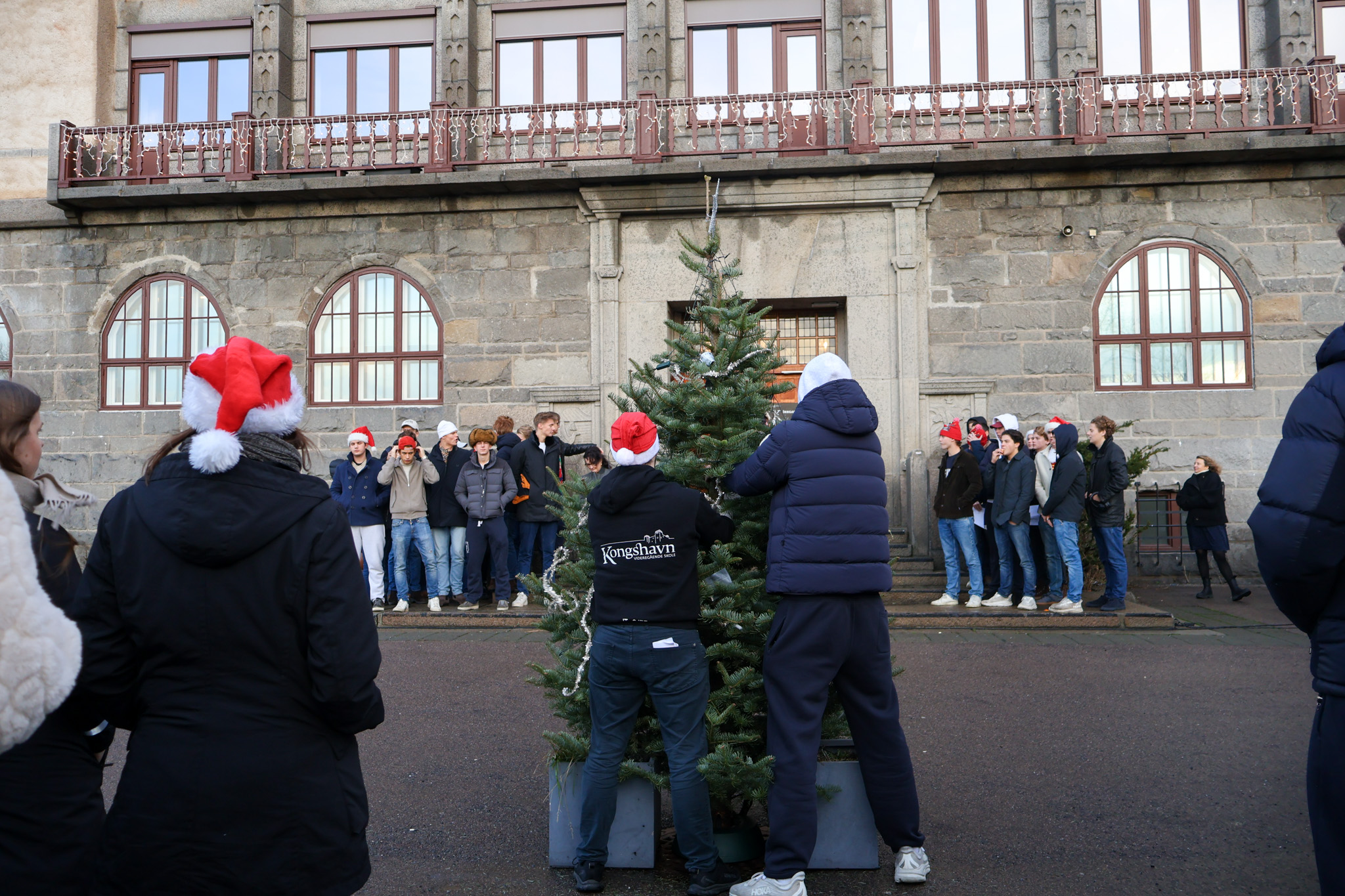 Det blåste friskt i skolegården siste skoledag før jul, men med litt støtte sto juletreet, og det ble en fin juleavslutning i år også. Rektor holdt tale, revysjefene leste et dikt og et utdrag av juleevangeliet. Kongshavns eget julekor sang julesanger mens hele skolen gikk rundt treet.